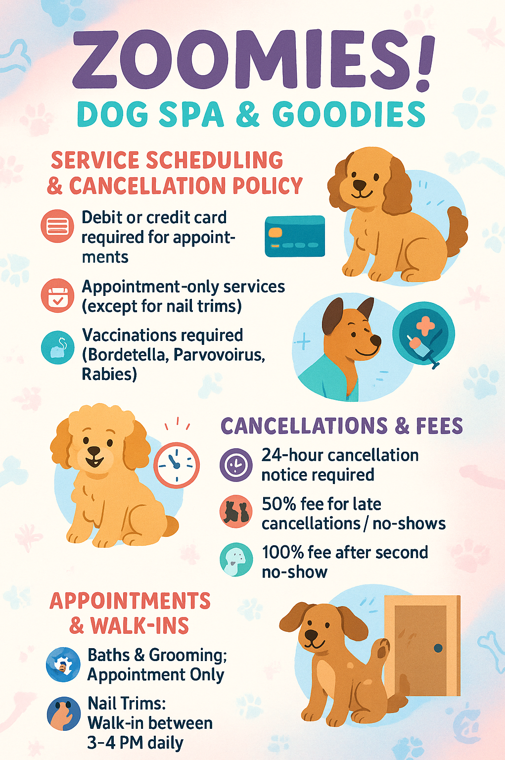 At Zoomies Dog Spa ("we", "us", or "our"), your privacy is extremely important to us. This Privacy Policy outlines how we collect, use, and protect your information when you visit our website www.zoomiesdogspa.com.