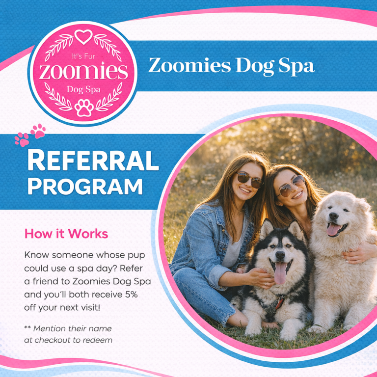 Know someone whose pup could use a spa day? Refer a friend to Zoomies Dog Spa and you’ll both receive